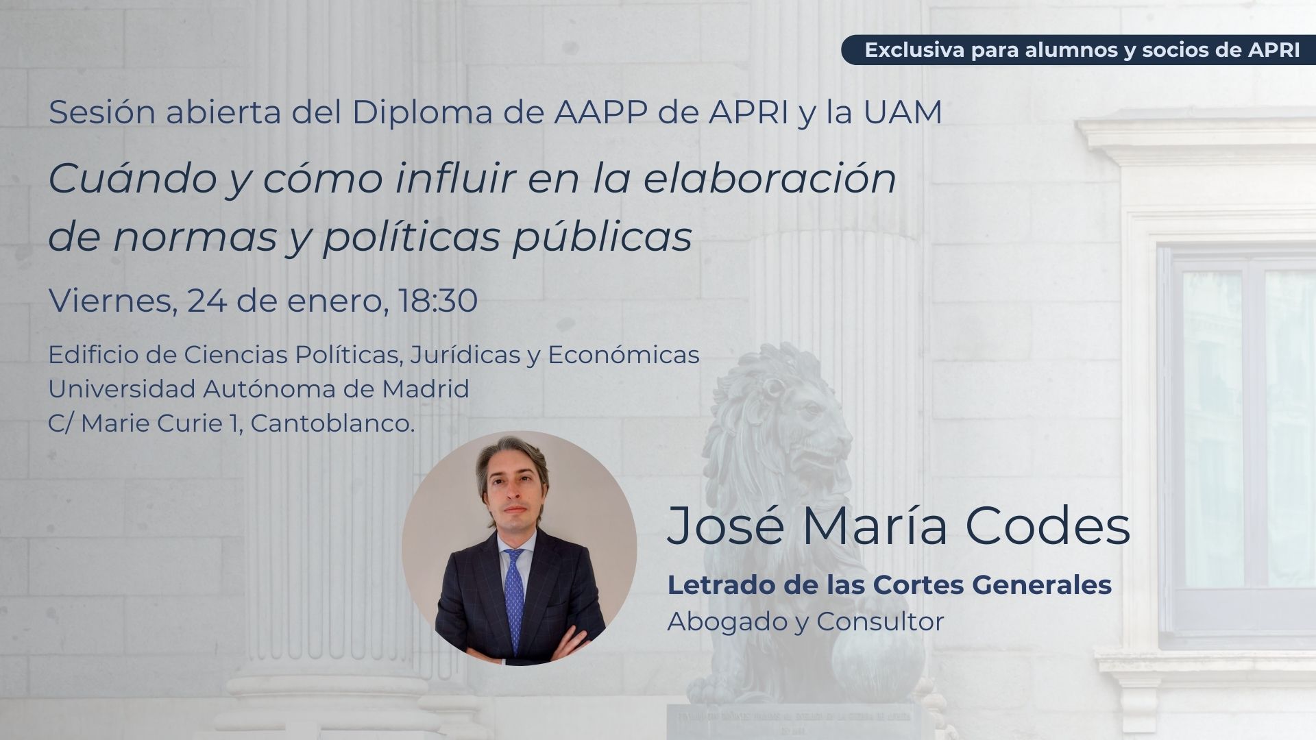 La sesión de este viernes, 24 de enero, sobre cuándo y cómo influir en la elaboración de normas y políticas públicas, estará abierta a los socios de APRI que deseen inscribirse, además de los alumnos del Diploma.