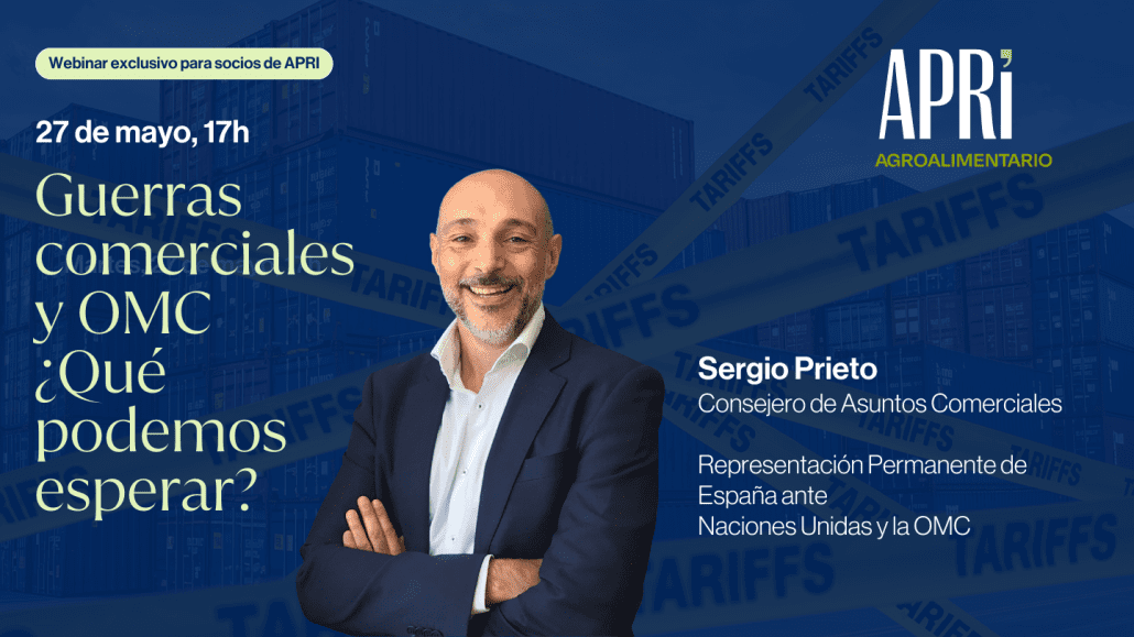 El grupo de trabajo de APRI Agroalimentario organiza un webinar el 27 de mayo a las 17h con Sergio Prieto, consejero de Asuntos Comerciales en la Representación Permanente de España Naciones Unidas y la Organización Mundial del Comercio, para abordar el impacto de las guerras comerciales en los mercados y cómo está actuando la Organización Mundial del Comercio para gestionar la situación.
