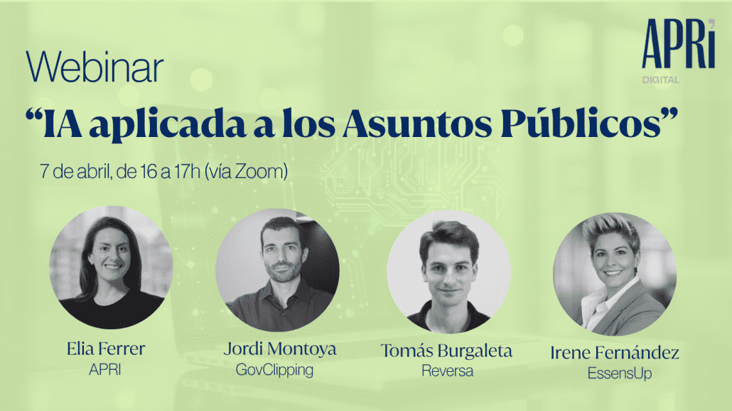 APRI organiza el próximo 7 de abril, de 16:00 a 17:00 horas, el webinar “IA aplicada a los Asuntos Públicos”, una sesión online pensada para acercar a los socios los usos más concretos, útiles y actuales de la inteligencia artificial en el ámbito de los asuntos públicos.