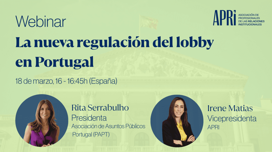 APRI organiza el webinar “La nueva regulación del lobby en Portugal”, una sesión breve y especializada para analizar los cambios normativos que afectan a la actividad de los asuntos públicos en el país vecino. El encuentro se celebrará el 18 de marzo, de 16:00 a 16:45 h (España), y contará con la participación de Rita Serrabulho, presidenta de la Asociación de Asuntos Públicos de Portugal (PAPT), y Irene Matias, vicepresidenta de APRI.