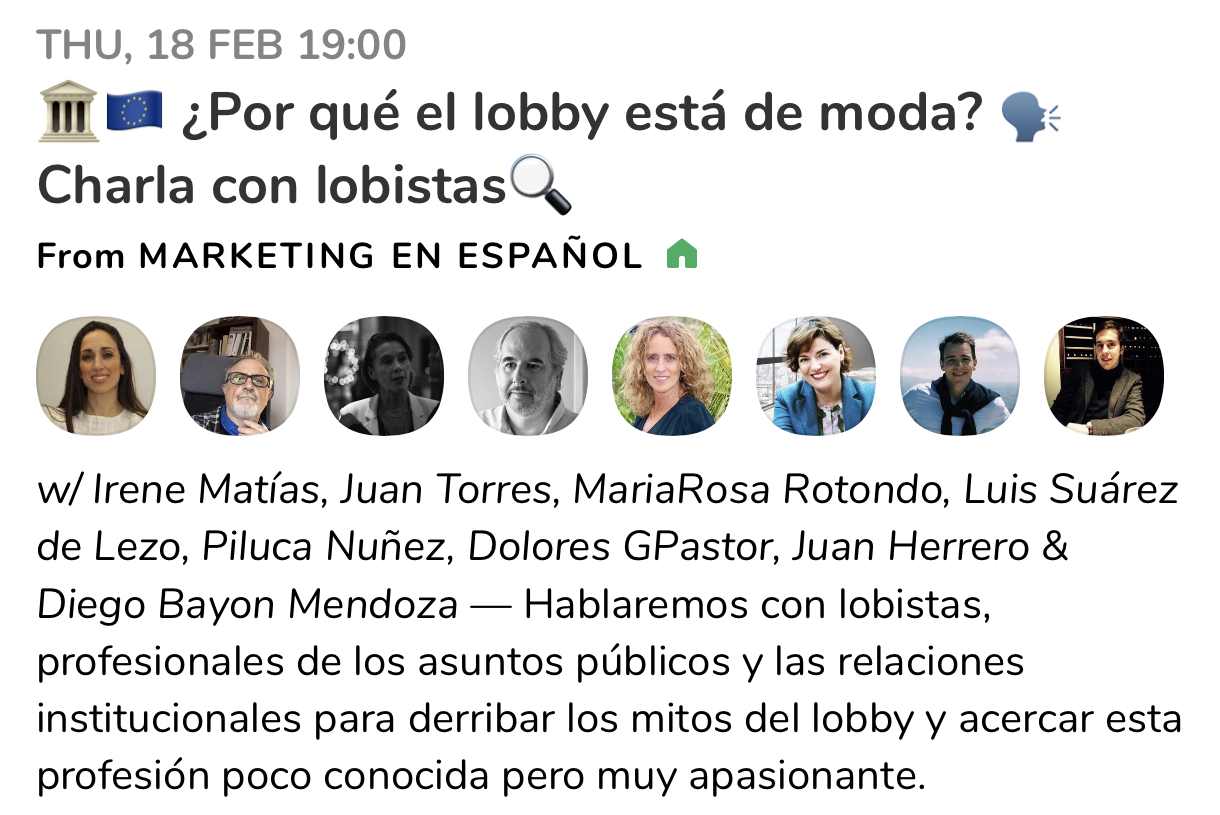 APRI se estrena en Clubhouse ?? el próximo 18 de febrero a las 19:00 para hablar sobre qué es el lobby, qué hacen los lobistas y derribar mitos de nuestra profesión. Participarán los miembros de la Junta Directiva de APRI Maria Rosa Rotondo, Luis Suárez de Lezo, Juan Torres, Piluca Núñez López, DOLORES GONZALEZ PASTOR, Juan Alfonso Herrero y Diego Bayón Mendoza. Modera: Irene Matías Campano.